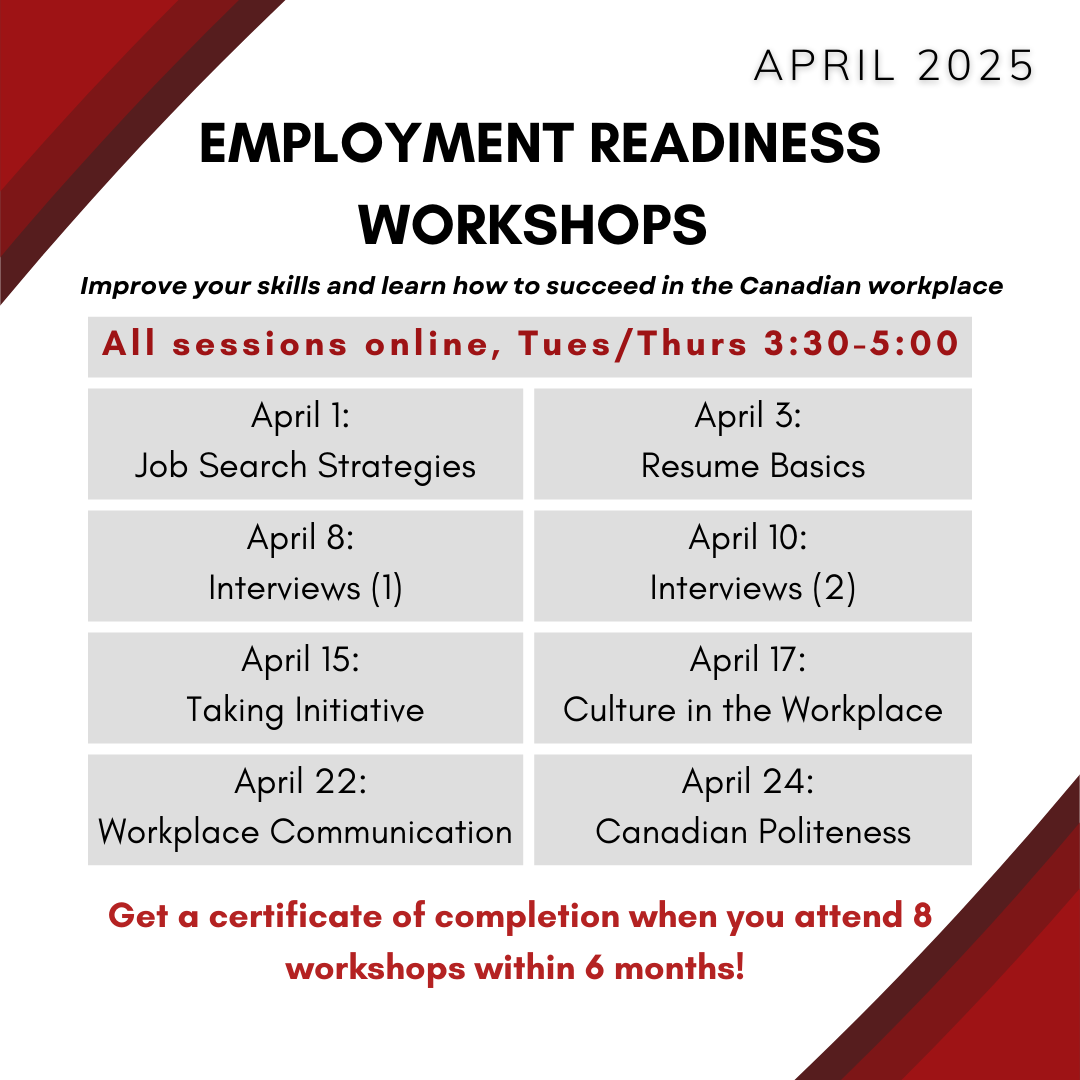 We offer newcomers resume and interview coaching, information and orientation, interpretation services, and referrals to employers, with both individual services and group programs.